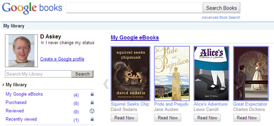 Google’s new bookstore is something of a half-baked enterprise, which surprises me. On the one hand, it has Google’s characteristic clean design, which allowed me to go from browsing to reading a sample in about six seconds and with a couple of clicks. Kudos to them there. That said, the ability to manage one’s collection is a bit weak. I clicked to add a sample to my personal bookshelf, and when I consulted said bookshelf, I discovered that it had four titles on it.