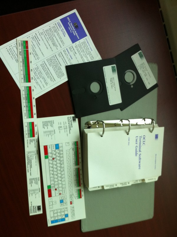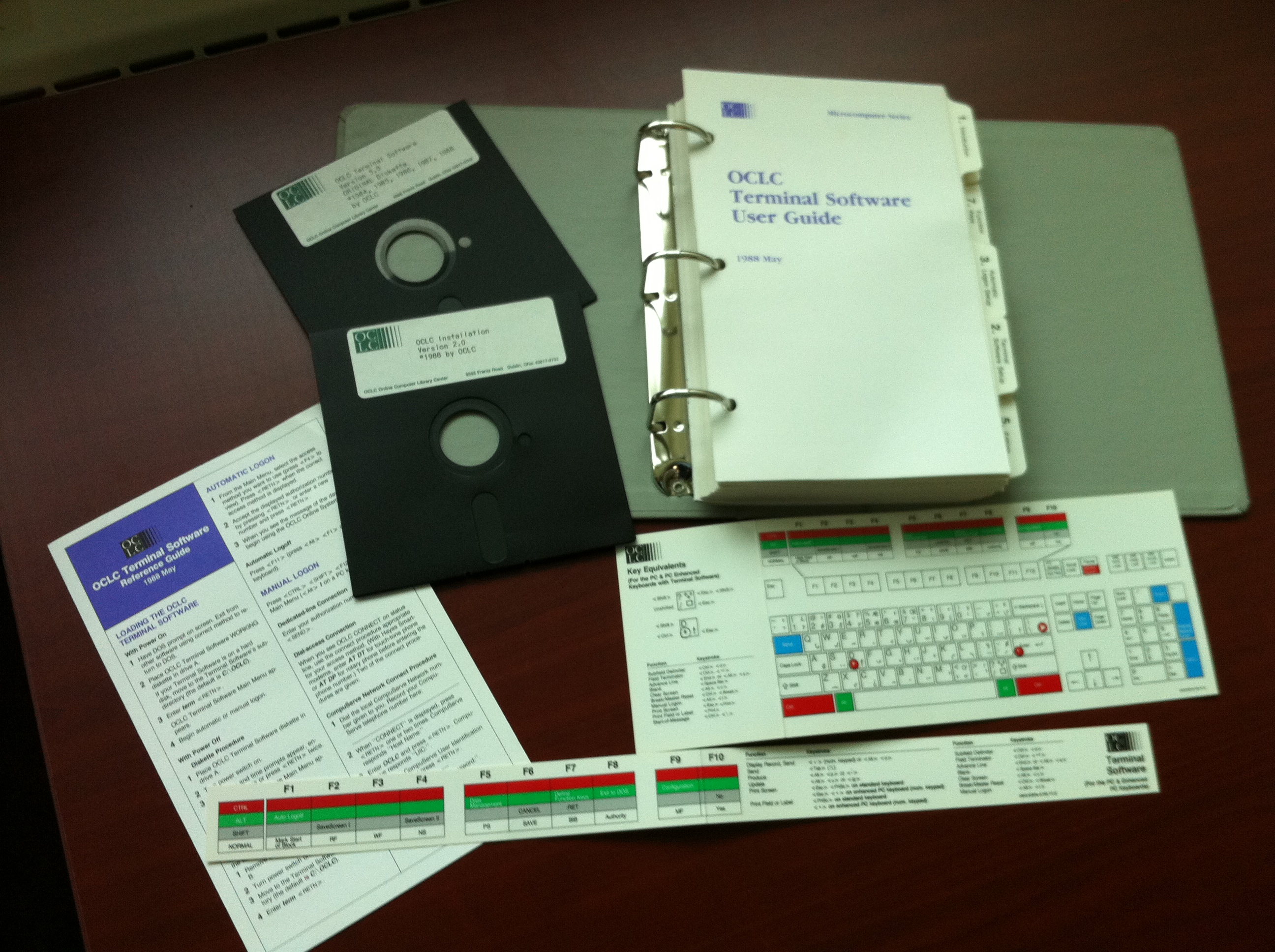 While wandering around this afternoon in our server room/IT storage cave, I ran across this pristine copy of the OCLC Terminal Software User Guide ca. 1988, complete with laminated keyboard shortcut guide and function key decoder.