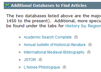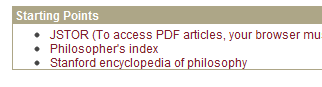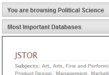 To drive the point home, here are some visual examples. The example at the top of this post comes from Kansas State University, which lists JSTOR as the most important database for political science, quite a feat of irony. In the field of philosophy, the University of Kansas lists JSTOR before The Philosopher’s Index